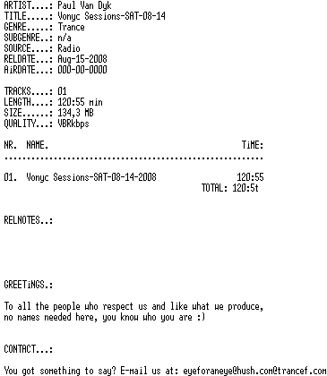 This week special broadcast of Armin’s solo set recorded LIVE from Armada @ Amnesia on Ibiza (12-08-08) ARTiST .....:: Armin van Buuren TiTLE ......:: A State of Trance 365 - live from Amnesia-NET-14-08-2008-iRUSH GENRE ......:: Trance SOURCE .....:: Radio DATE .......:: 14-08-2008 QUALiTY ....:: MP3 / CBR192 / 44100 / JOINT STEREO RiPPER .....:: iRUSH ANNOUNCED ..:: http://www.trancef.com LiSTiNG ....:: 01-Armin_van_Buuren_-_A_State_of_Trance_365_-_live_from_Amnesia-NET-14-08-2008-iRUSH.mp3 123:38 169.78MB DownloaduTorrent DownloadRapidShare